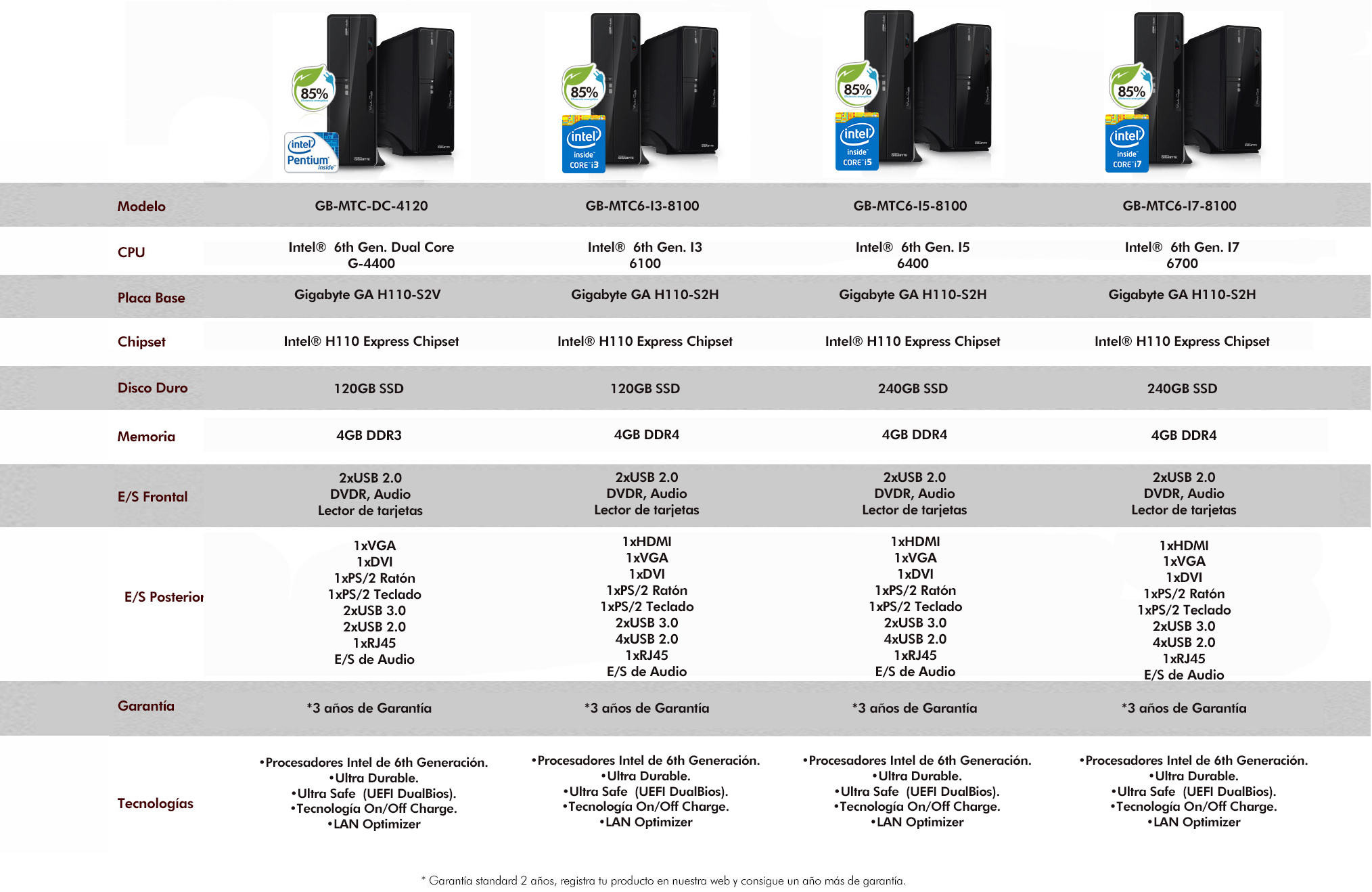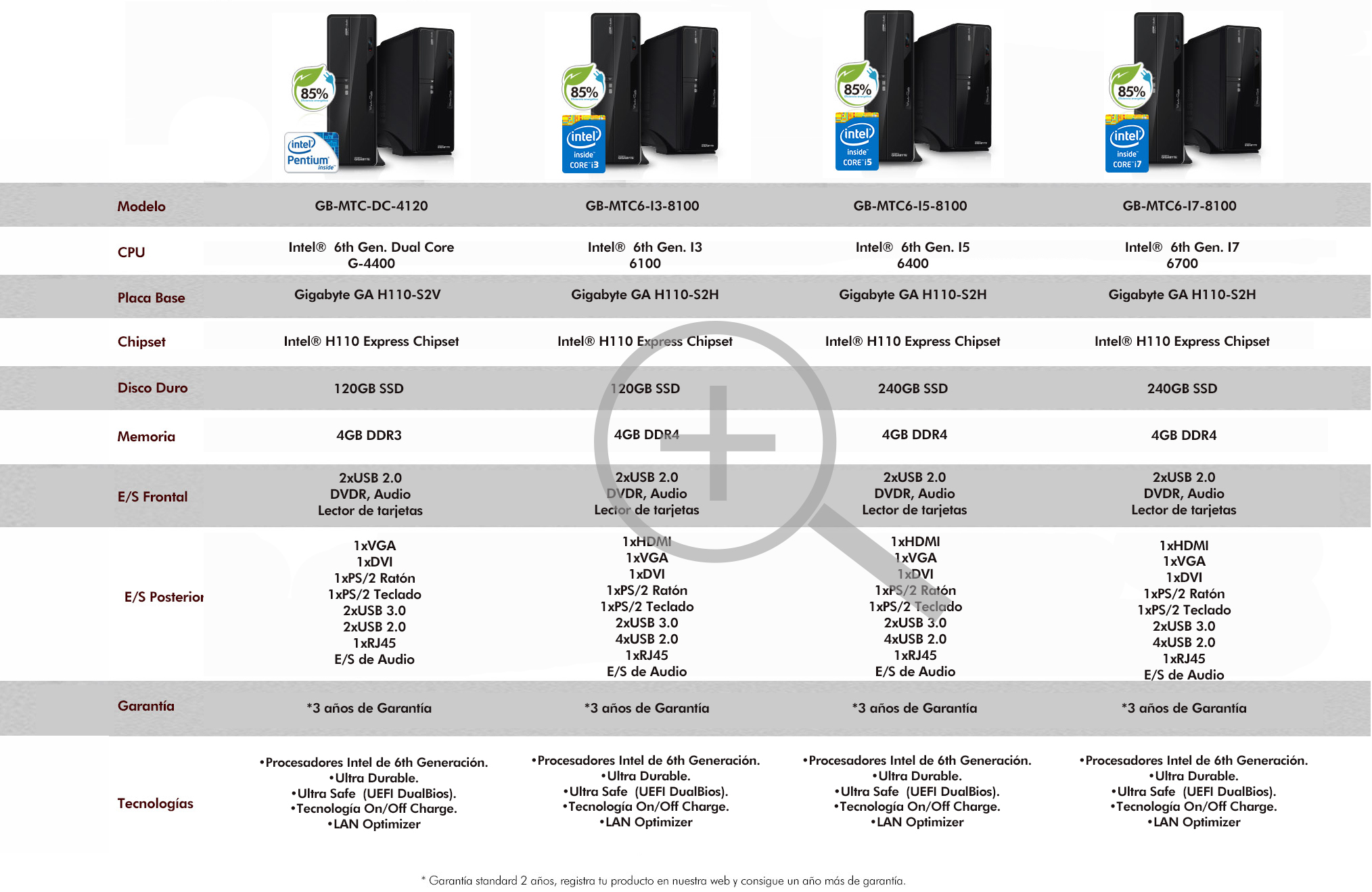 VGA(1920X1200@60Hz), DVI(1920X1200@60Hz), 2XPS/2, Realtek Gigabit Lan(10/100/1000 Mbit), 2xUSB 2.0 + 2xUSB 3.0 (traseros), 2xUSB 2.0 + Lector de tarjetas SD/ Micro SD (Frontales), Audio 7.1 Realtek de Alta Definición, 1xPCI Express X16, 1xPCI Express X1, Regrabadora DVD RW, Fuente de alimentación de 300W 85+.